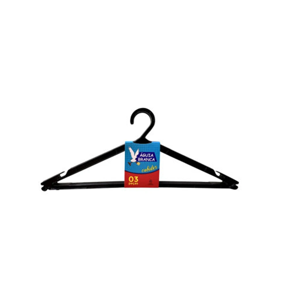 Cabide de plástico preto (3 unidades) Águia Branca Pacote com 3 cabides pretos de plástico reforçado, feitos de polipropileno 100% reciclável e super resistente. Praticidade e sustentabilidade no seu varal!