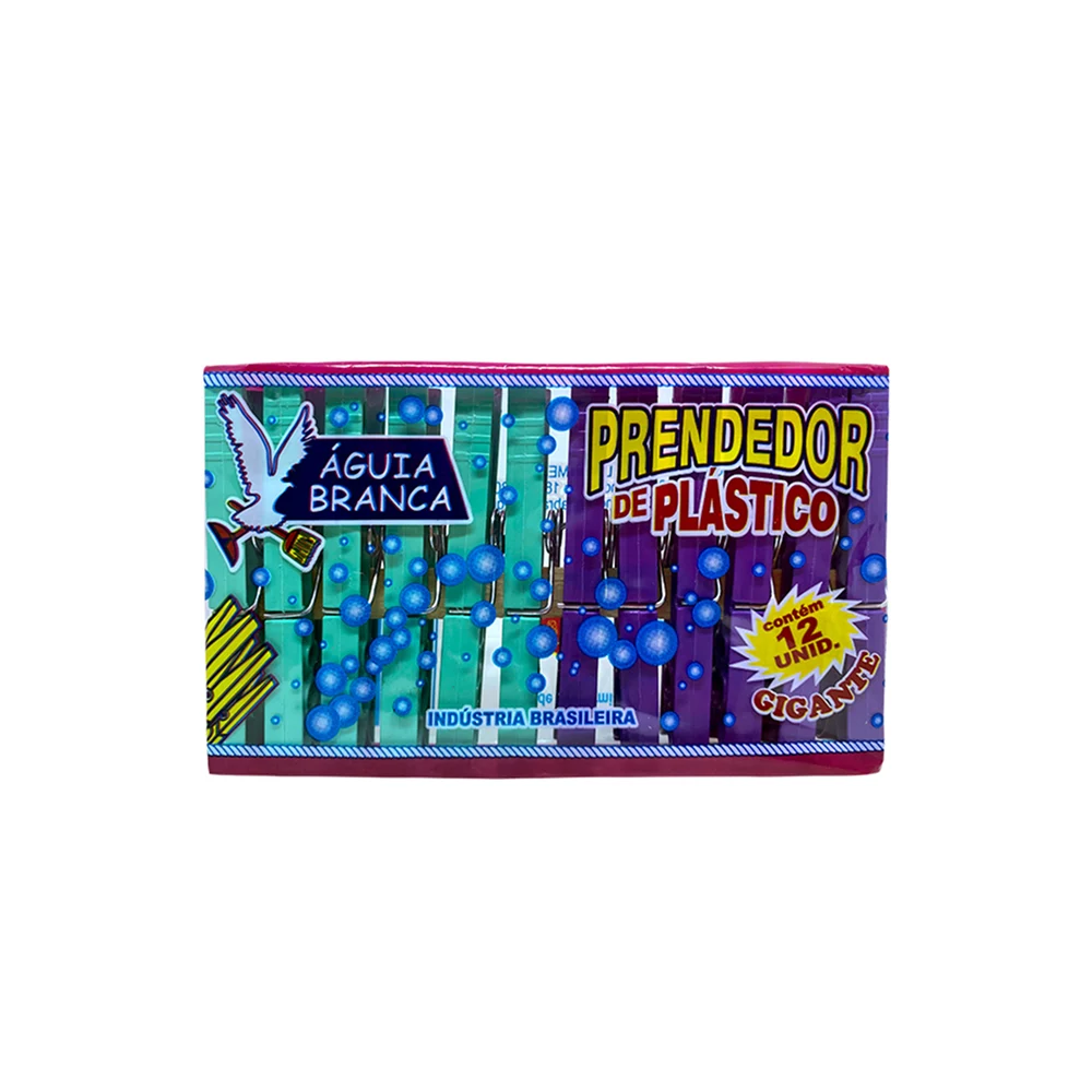 Prendedor Plástico Gigante 12 unidades Águia Branca Pacote com 12 unidades de prendedor de plástico, tamanho gigante, com mola de aço galvanizado.